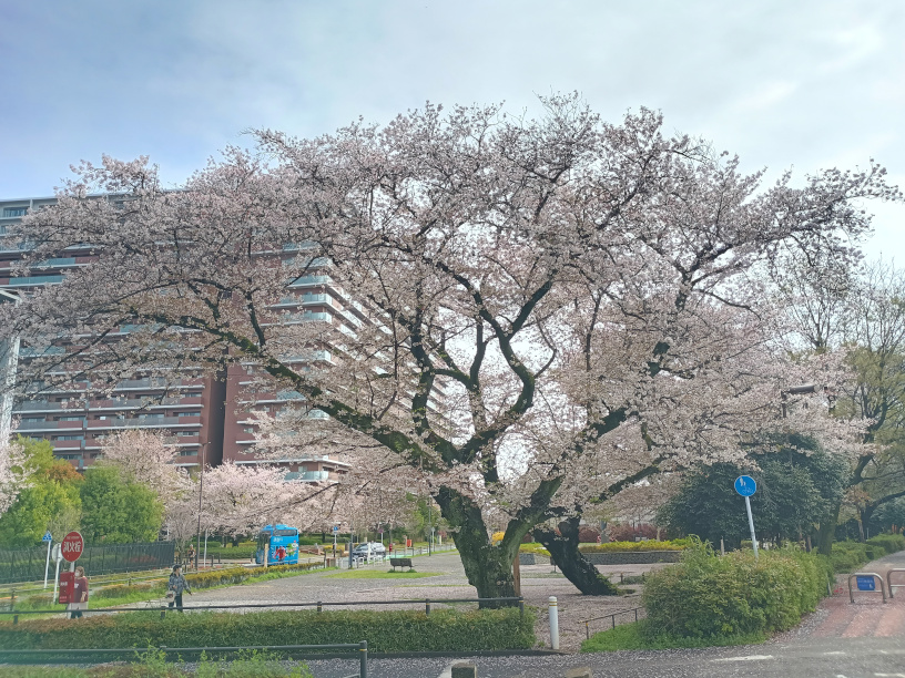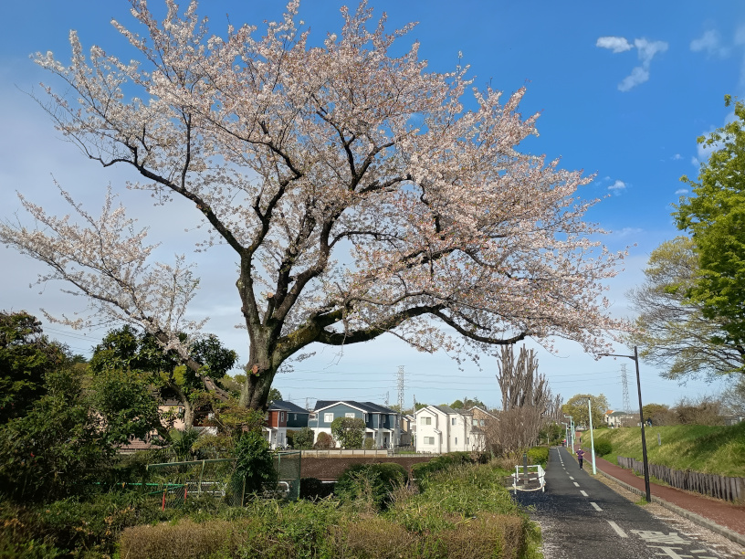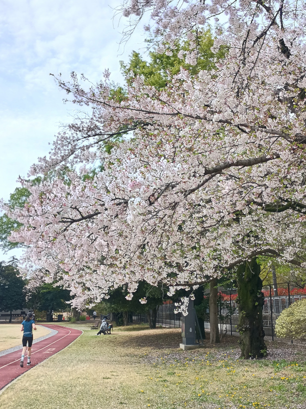 多摩湖自転車歩行者道の隅っこまで来たのでちょっと北上します。武蔵野大学を過ぎたところにMUFGパークというのがあります。自由に入れるのと、そこにトラックがあるので回ってみます。葉っぱ混じりですが、見事な桜がありました。トラックが絵になりますね。