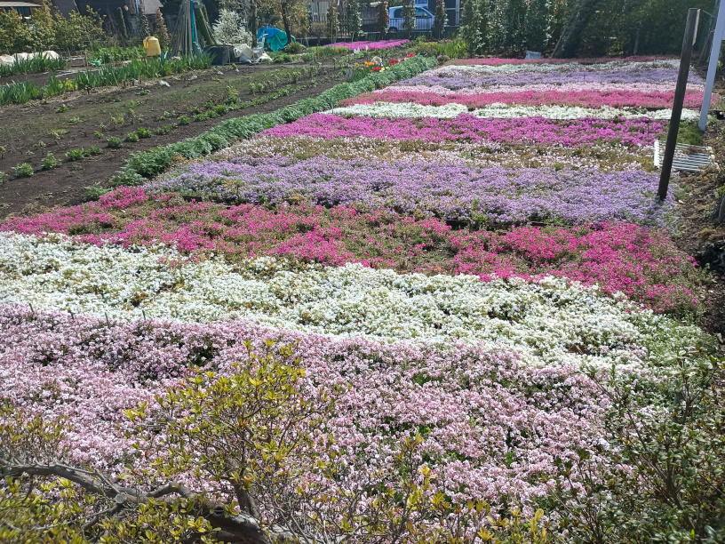 チェリーブロッサムの桜ではなく芝桜もあります。多摩湖自転車歩行者道周辺は、販売用の樹木や花を育てているところも多く、この芝桜もその一つと思われる。サイクリングロードを区切ってしまう横断歩道の近くに咲いてるので近くを通ったら楽しんでほしい。