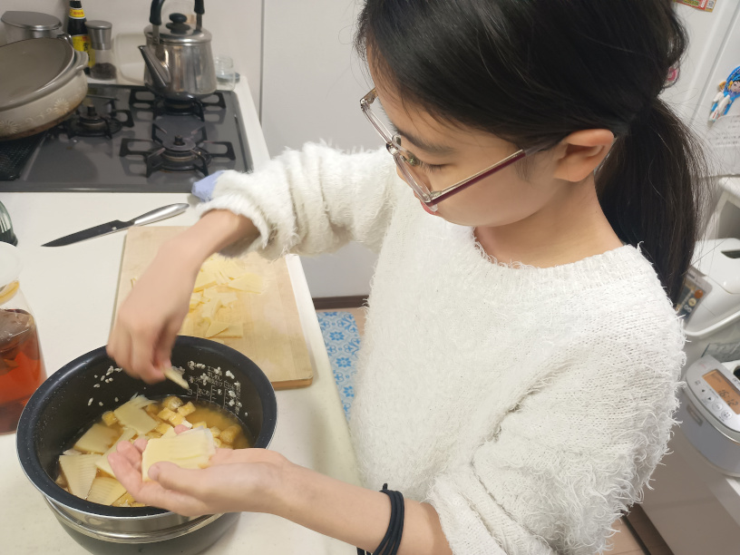 晩御飯はもらったタケノコで炊き込みご飯にします。今夜は次女ちゃんがお手伝いしてくれました。