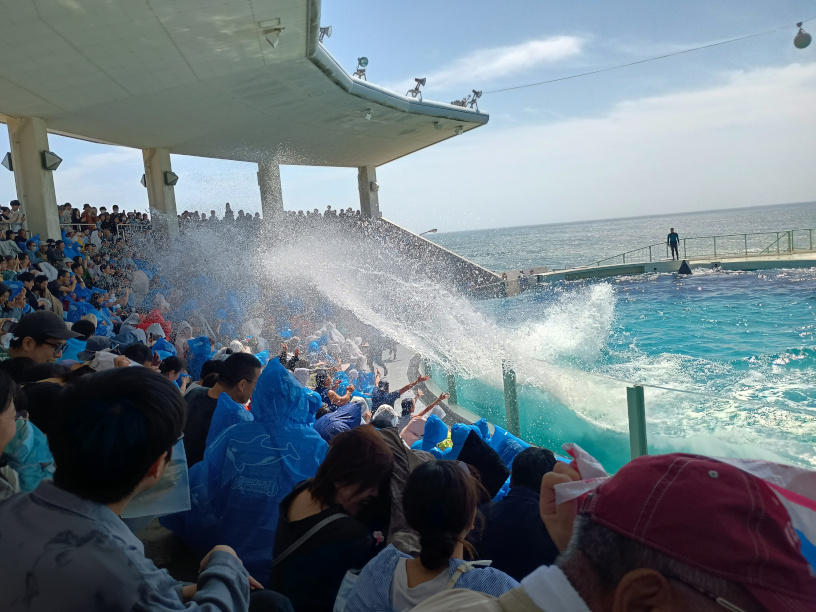 10年前は最後尾で立ち見した気がするのでそれほど水かぶりの記憶がない。今回も大丈夫だろうと高をくくってたが、甘かった。「水がかかるかもしれません」表示の無いベンチでもちょっとかかった。まわりはレジャーシートなどで防ぐ準備をしてたので、りょうすけくんが水をかぶらなくて良くなった感じ。鴨川シーワールドでシャチのショーを見る人はそれなりに気をつけていこう。