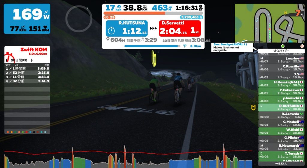 ここで我慢できなくてトイレに…。「我慢できないのでトイレ。みんな続けてて〜。」メッセージしたんだけど「我慢」と「。」が表示されませんね。Zwiftさんはこの辺アップデートする気ないのかなー。