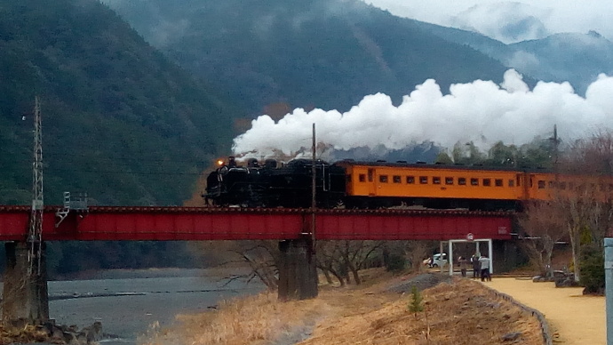 あと一日数回、大井川鉄道のSLが近くの鉄橋を通ります。今日は15時半に通るとのことだったので、休憩時間を調整して通過ポイントに移動しましたね。移動、って言いますがそんな大したことなくて、この鉄橋のすぐ横が温泉の駐車場です。